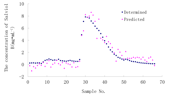 The REMS of the concentration of Salviol B was 0.3263, the MAE was 0.2323 and the CV was 0.1796. The predicted value of Salviol B using UV spectral data and the determined concentration by HPLC were shown in figure 7.