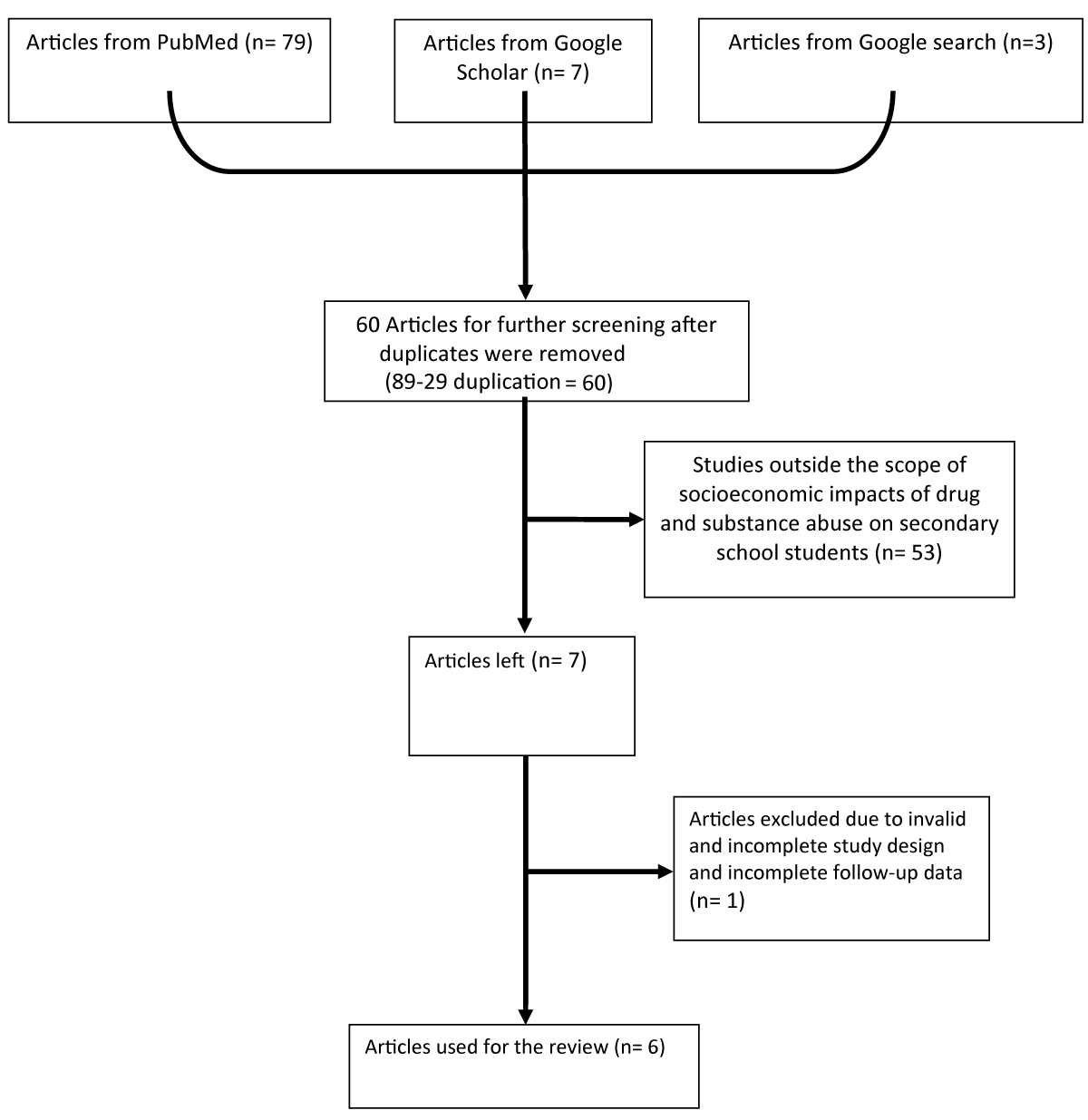 A total of 89 articles were obtained, 79 from PubMed, 7 from Google Scholar, and 3 from Google Search on the elimination of duplicates. After a thorough assessment, 29 duplicate articles were further removed, and 53 articles were also excluded for not covering the scope of socioeconomic impacts of drug and substance abuse on secondary school students. Further screening ensured the exclusion of 1 article due to invalid and incomplete study design and incomplete follow-up data, leaving 6 studies left for use for the review.