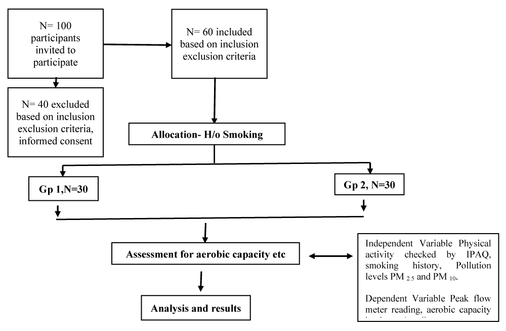 Figure 2: Study flow chart – showing population and sample as per the inclusion and exclusion criteria, allocation based on the smoking history. The variables physical activity checked by international physical activity questionnaire (IPAQ), aerobic capacity checked by Queen’s college step test, and PM2.5 and PM10 levels from pollution control board website data.