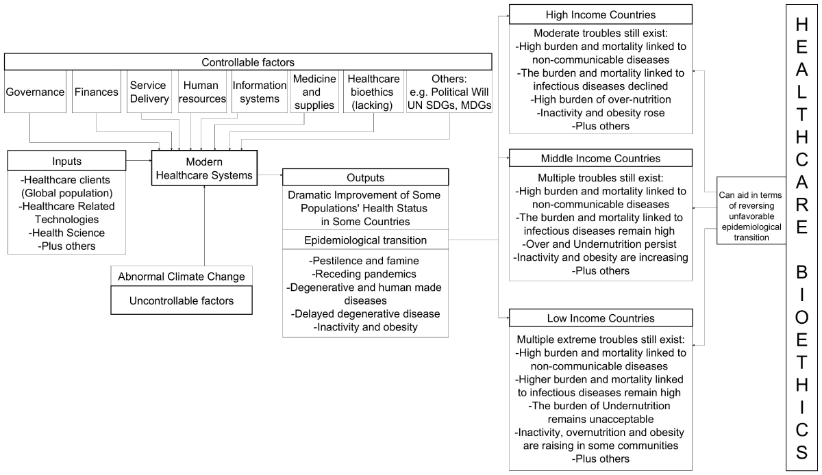Modern healthcare systems have greatly improved as a result of the rapid advancement of science and technology. Figure 1 represents inputs, outputs, and controllable and uncontrollable factors that have led to the advancement of modern healthcare systems. Looking back, scientific and technological revolutions that have been occurring since the Renaissance era have trendily changed healthcare systems. Examples of passionate health-related scientists whose works helped pave the way for contemporary healthcare systems include William Harvey (1578–1657), Andreas Vesalius (1514–1564), Ambrose Pare (1509–1590), Girolamo Fracastoro (1478–1553), Paracelsus (1493–1541), Leonardo Da Vinci (1452-1519), John Hunter (1728–1793), Edward Anthony Jenner (1749–1823), Joseph Lister (1827–1922), Louis Pasteur (1822–1895), John Snow (1813–1858), Alexander Fleming (1881–1955) [4-8], plus others. Trendily, an epidemiologic shift in a number of diseases has occurred as a result of the use of new scientific discoveries in contemporary healthcare systems. Epidemiologic transition designates the trail of changes in the patterns of population age distributions, mortality, fertility, life expectancy, and causes of death in a given nation [9,10]. The epidemiologic transition can be described in five phases [11]. Phase 1 (pestilence and famine) is dominated by malnutrition and infectious diseases as the cause of death [9]. Higher children’s mortality and low mean life expectancy indicate this phase. Phase 2 (receding pandemics) comprises improving nutrition and public health services to result in a drop in the rates of deaths connected to malnutrition and infections [5]. Phase 3 (degenerative and human-made diseases) is discerned by augmented fat and caloric intake and a decrease in physical activities, leading to a higher prevalence of non-communicable diseases (NCDs), for instance, hypertension, diabetes, atherosclerosis, etc. Mortality linked to non-communicable diseases surpasses mortality from malnutrition and infectious diseases. Phase 4 (delayed degenerative disease) is marked by high morbidity and mortality due to cardiovascular diseases and cancers. The accessibility of better treatments and preventive efforts help to avoid deaths from these diseases. Phase 5 (inactivity and obesity) is marked by an upsurge of overweight and obesity at intolerable rates, coupled with increased rates of hypertension, diabetes, etc. Putting more efforts into preventive measures, for instance, reducing smoking rates and encouraging physical activity, can reduce the burden of diseases appearing in this phase. A favorable epidemiologic transition would have been homogenous worldwide if there were no differences in modern healthcare on a global scale.