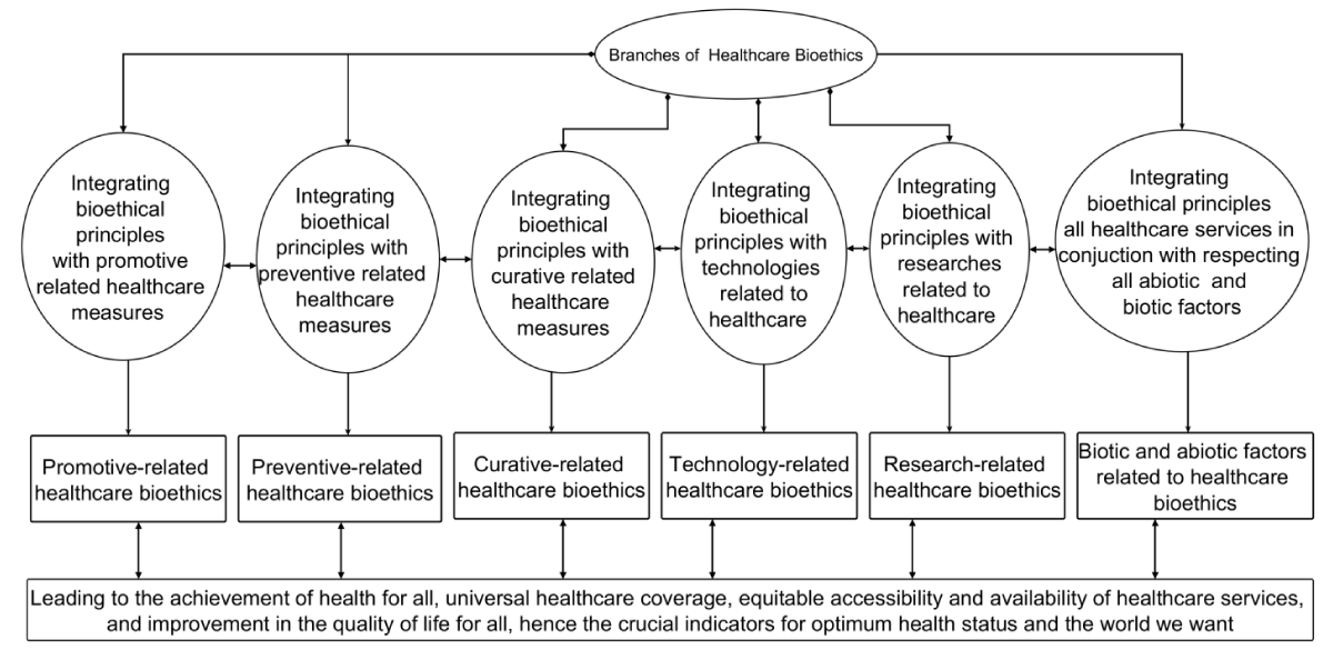 The author wishes to comprehensively describe the components of the healthcare bioethics system. Widely, these descriptions pinpoint all features that are of considerable interest in terms of combining techno-scientific knowledge with moral issues in order to maximize humans’ health, dignity, and rights. Since the inception of bioethics, numerous authors and organizations have expressed an interest in it. One of the outcomes of those authors and organizations has been the publication of uncountable works. They sympathetically made their manuscripts, books, and reports accessible to us in advance in various publications. However, most of their works seem to narrowly focus on ethical issues that arise from daily clinical practices and research fields. No further accounts have been given to describing bioethical knowledge, theories, and practices as mechanisms of wisdom enhancement that can result in the improvement of people’s health and well-being. Global bioethics has also been established, but it has been criticized for not being a sufficiently unified field [43], partly due to a lack of thorough descriptions of its elements. In the author’s opinion, such a lack leads to unsatisfactory outcomes for some branches related to global bioethics, which may also negatively affect healthcare bioethics.