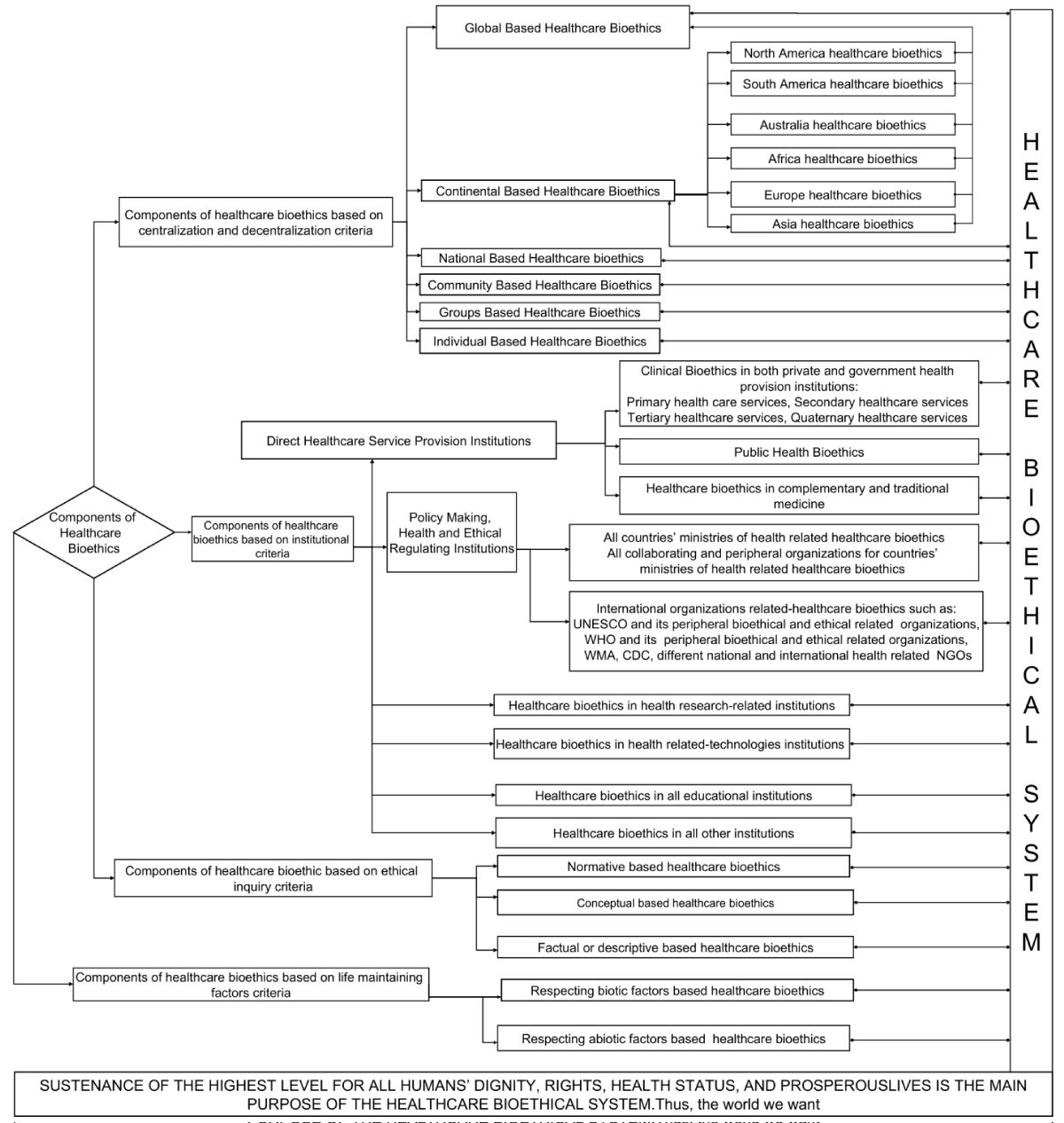 Hitherto, there are no homogeneous ways to understand all ethical dilemmas and health-related problems that have been affecting the global population because each individual, community, country, and continent possesses unique moral principles that guide their actions. Ethical questions related to health, health care, and public health cover topics as diverse as moral issues surrounding individuals in ensuring healthy lives, community ambitions for ensuring healthy communities, healthcare providers obligations in the provision of effective and efficient healthcare services to their clients, state obligations in the provision of health care services, appropriate measures to control all diseases, appropriate measures to ensure advancement of technology and science without destroying people’s health, etc. The spectrum and mechanisms for understanding those moral issues are diverse from one region to another, from person to person, etc. Despite such diversity, it should be emphasized that those moral issues must be probed properly and integrated with scientific facts to improve the health status and well-being of the global population. Pooling moral issues and scientific facts would be the best approach for creating bioethical knowledge to help people improve their quality of life. Accomplishing that would make a healthcare bioethical system. Though not exhaustive, using four criteria: 1) centralized and decentralized-based criteria; 2) institutional-based criteria; 3) ethical inquiry-based criteria; and 4) life-sustaining factors-based criteria The components of the healthcare bioethical system are shown in Figure 3. All components of the healthcare bioethics system should be used to enable the attainment of prosperous lives and the highest level of dignity for the global population.