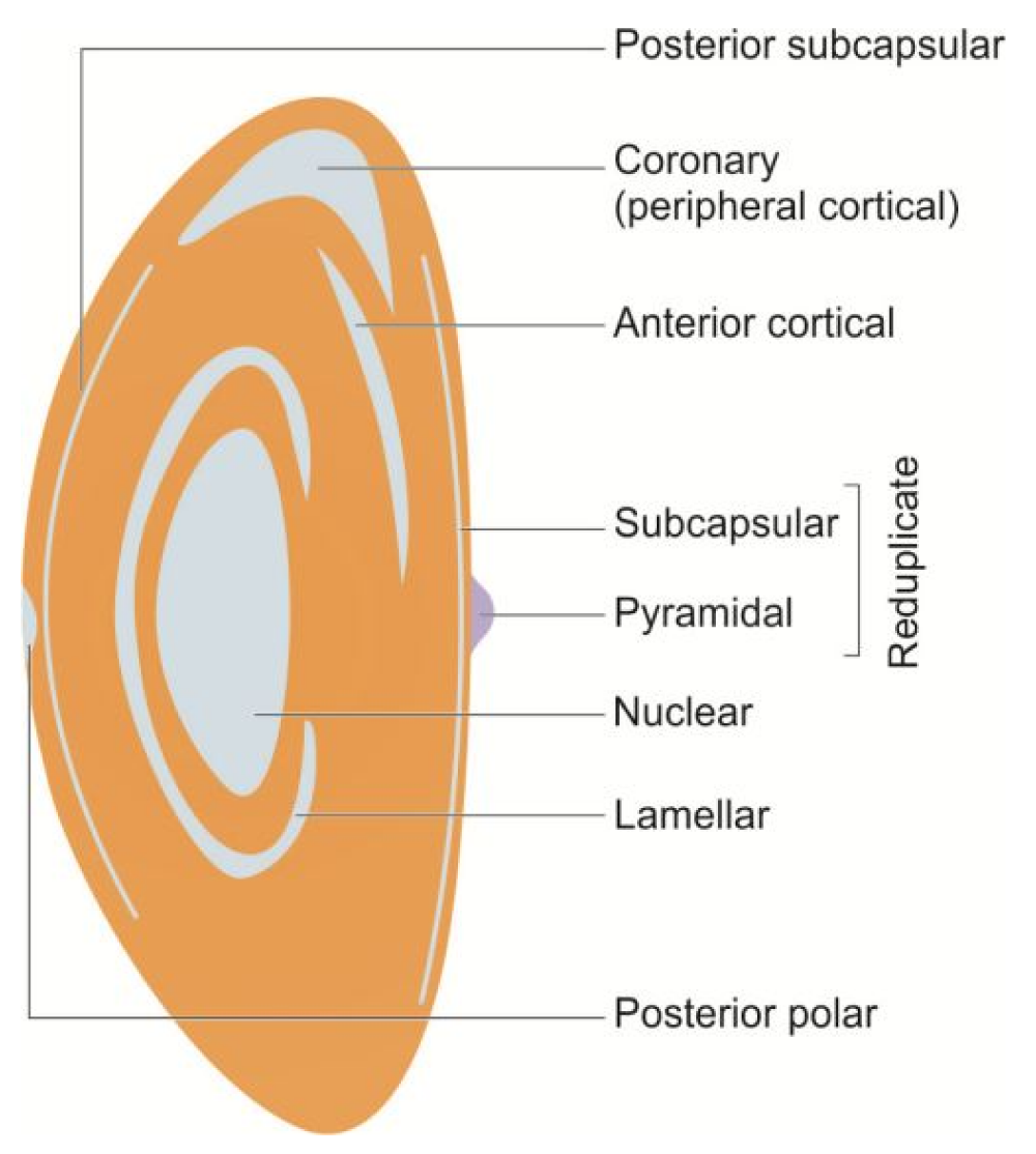 Figure 3: Diagrammatic representation of morphological types of cataracts. (Source: A. K. Khurana Comprehensive Ophthalmology, 2015 [15]).