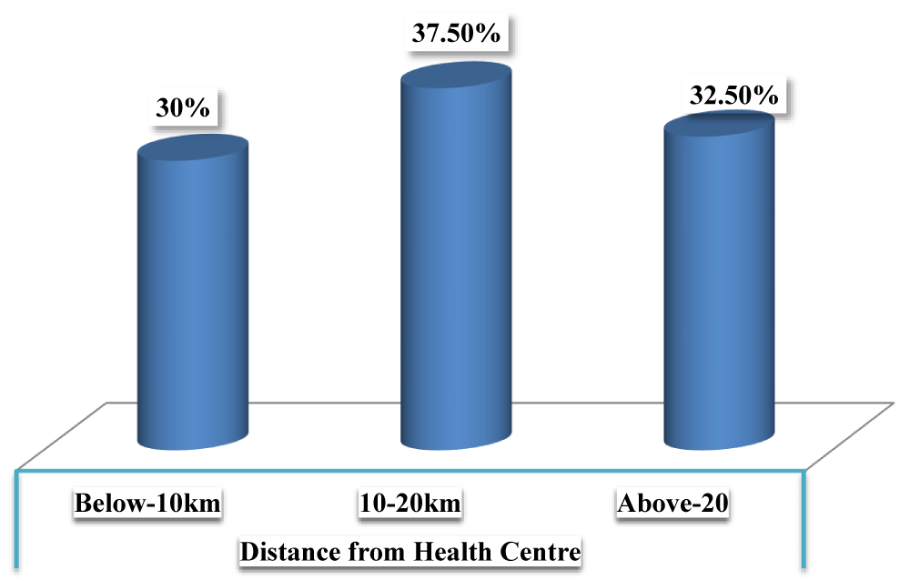 The bar chart illustrates the distribution of respondents based on their distance from the nearest healthcare center. The highest proportion (37.5%) resides 10–20 km away, while 32.5% live more than 20 km from a health center, highlighting accessibility challenges. Only 30% of respondents are located within 10 km, indicating that a significant portion of the population faces considerable travel distances for healthcare services. These findings emphasize the need for improved healthcare accessibility, particularly for those living farther away (Figure 2).