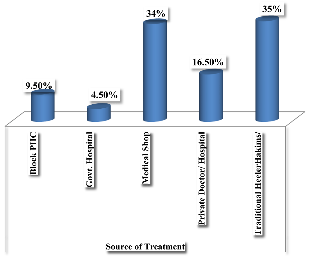 The bar chart represents the percentage distribution of respondents based on their preferred sources of treatment. Traditional healers (Hakims) are the most commonly sought treatment option, accounting for 35% of respondents, followed closely by medical shops at 34%. Private Doctors or hospitals are utilized by 16.5% of individuals, while only 9.5% visit Block PHCs, and a mere 4.5% seek treatment at government hospitals. The data highlights a strong reliance on traditional and informal healthcare providers over formal medical institutions.